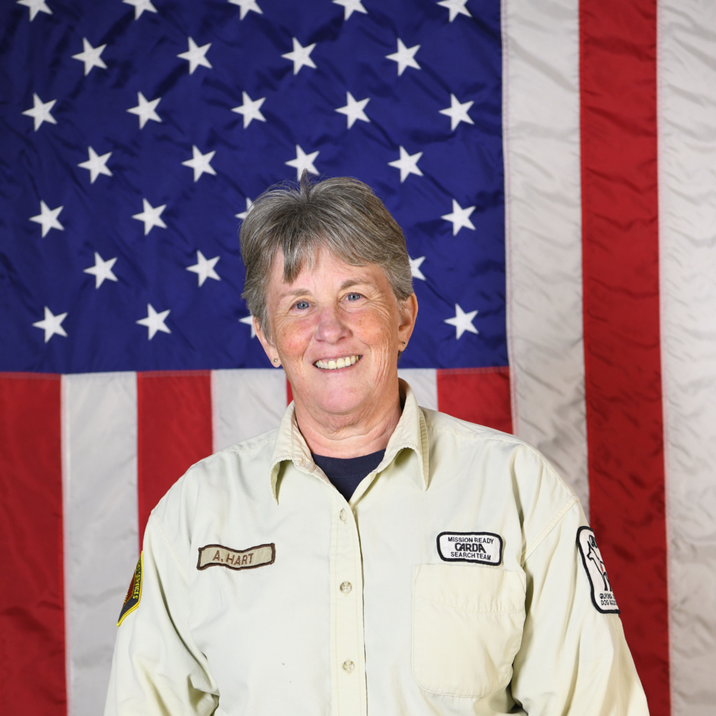 Alyson Hart provided extraordinary leadership in her many years in CARDA. She joined in December 1999 and successfully certified two dogs in both trailing and human remains detection. She deployed on 127 searches and drove more than 12,000 miles to help locate the missing. As an evaluator and a sponsor, Alyson coached several trainees through the certification process, always upholding the highest standards.